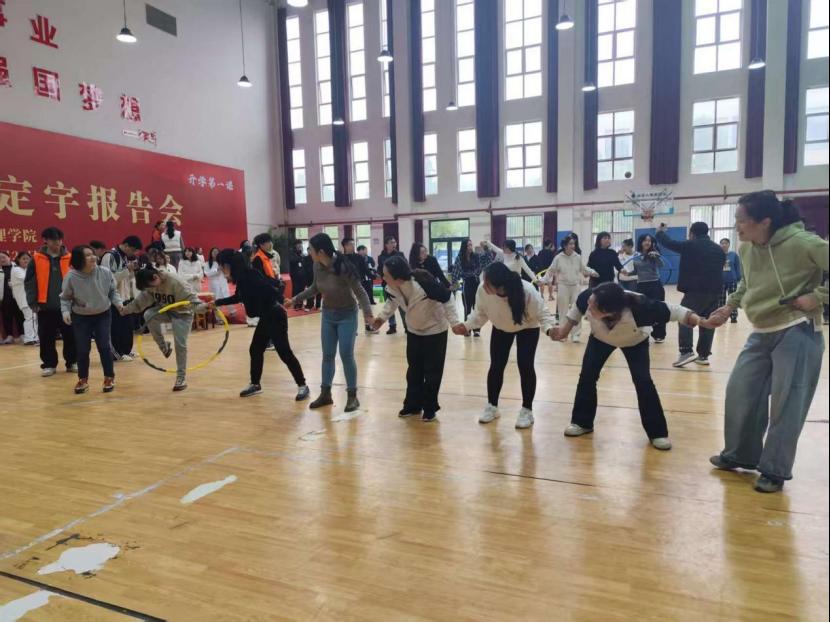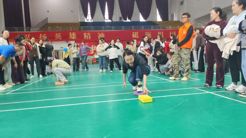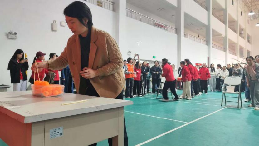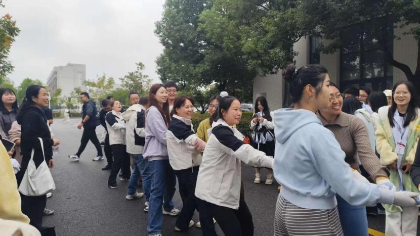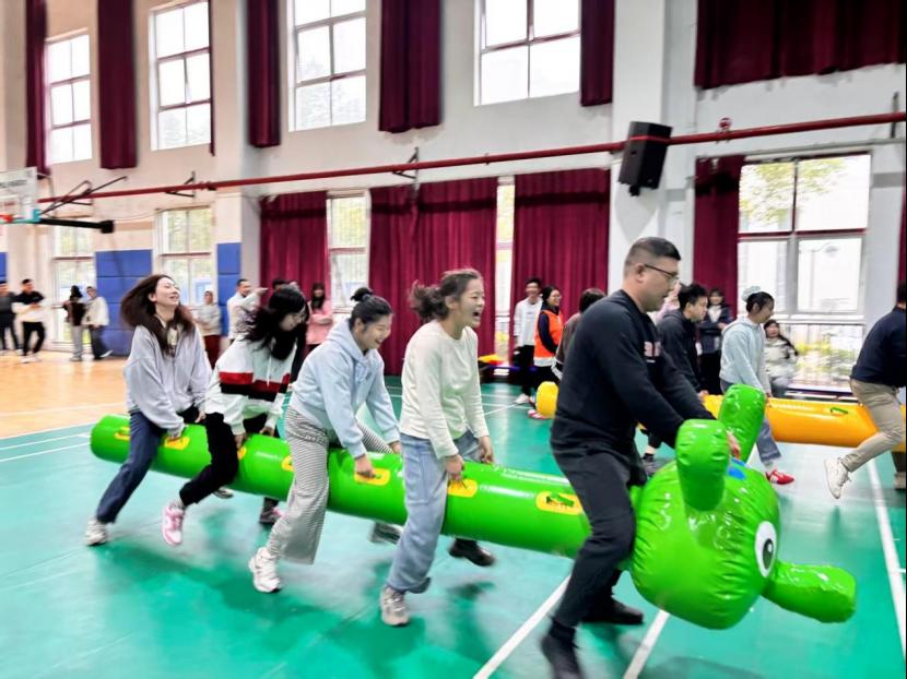 赛场上,各趣味项目亮点纷呈、欢乐不断。“毛毛虫”竞速环节趣味盎然,老师们组队同步迈步、默契配合,灵动穿梭间满是欢声笑语;穿越呼啦圈项目考验协作智慧,手拉手的队伍中,呼啦圈灵活传递,每一个衔接都彰显着团队的灵动默契;拔河赛场热血沸腾,紧握绳索的双手凝聚着同心协力的力量,整齐划一的号子震彻全场,展现出顽强拼搏的昂扬斗志;“摸石头过河”项目上,老师们步步为营,在平衡与速度间巧妙博弈,每一步都沉稳坚定;筷子夹乒乓球堪称“指尖挑战”,大家凝神屏气、稳夹传递,每一次成功交接都引来现场阵阵喝彩;投飞镖环节中,老师们目光锁定靶心、手腕轻扬,精准投掷间尽显专注巧劲。