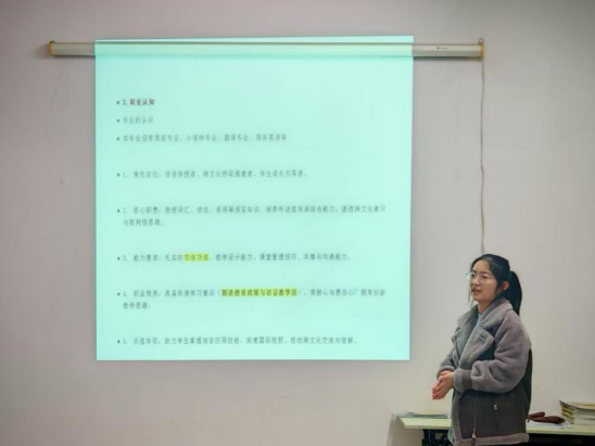 首先登场的是24级英语班的柴雨涵同学,她重点讲述了英语行业的发展全景。同时,她并未将目光局限于课堂,而是以宏大的视角,为同学们描绘了英语作为桥梁,在全球化、人工智能时代不可替代的价值与发展全景。她指出,未来的英语教师,不仅是语言的传授者,更是跨文化交际的引导者、批判性思维的激发者和人文素养的奠基人。