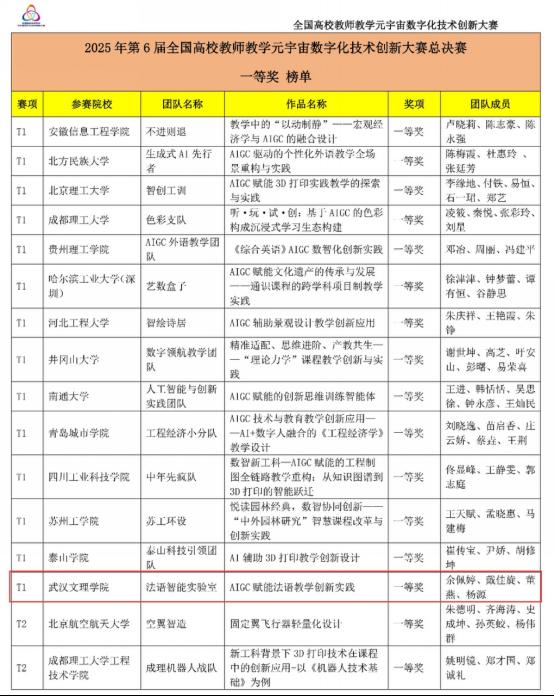 近日,2025年第6届全国高校教师教学元宇宙数字化技术创新大赛总决赛圆满落幕。来自全国22个省、市、自治区的81支参赛团队最终会师总决赛舞台,我校外国语学院“法语智能实验室”团队(成员:余佩婷、戴佳旋、董燕、杨源)凭借作品《AIGC赋能法语教学创新实践》斩获全国一等奖。该作品紧扣教育数字化转型趋势,深度融合学院在“新文科”建设方面的积累,提出了一套创新且实用的法语教学改革方案,获得评委一致认可。