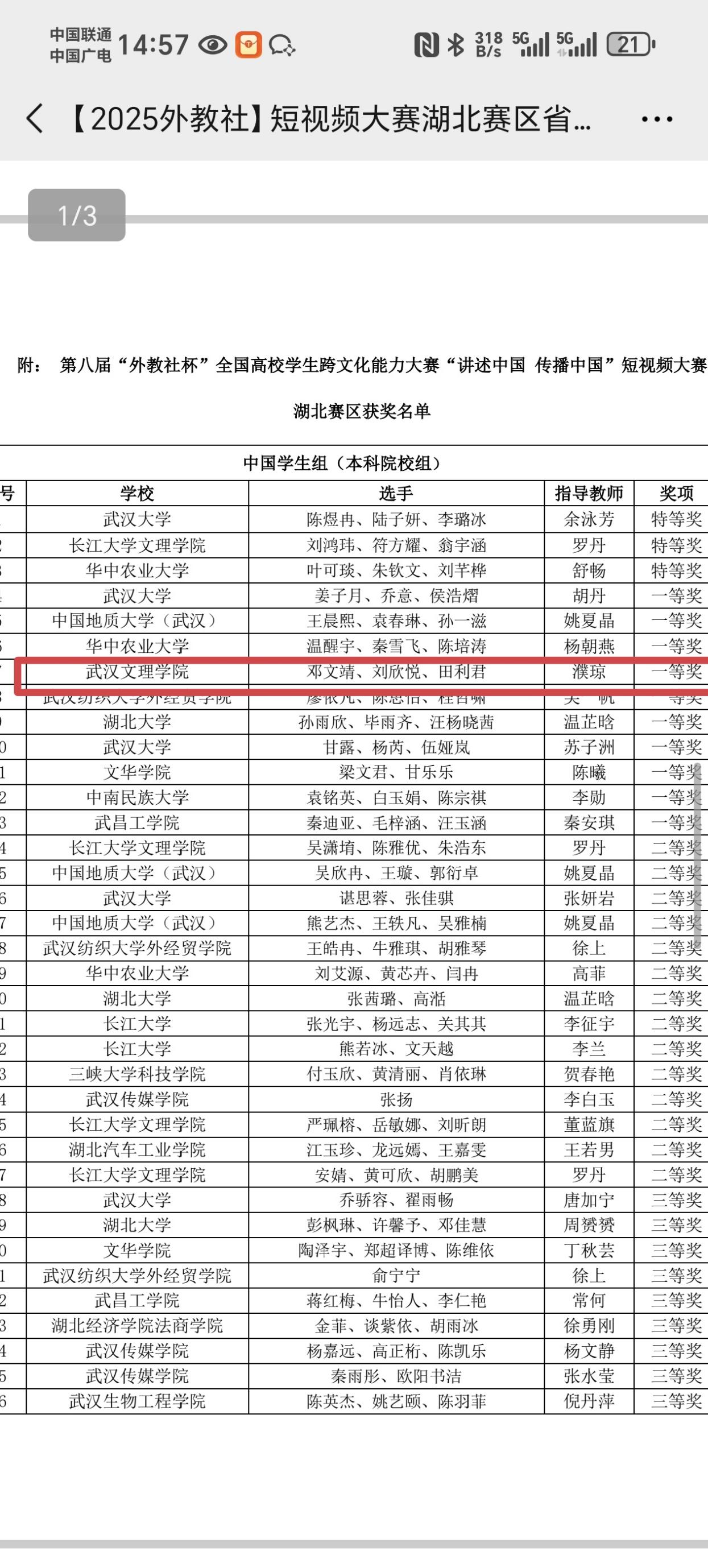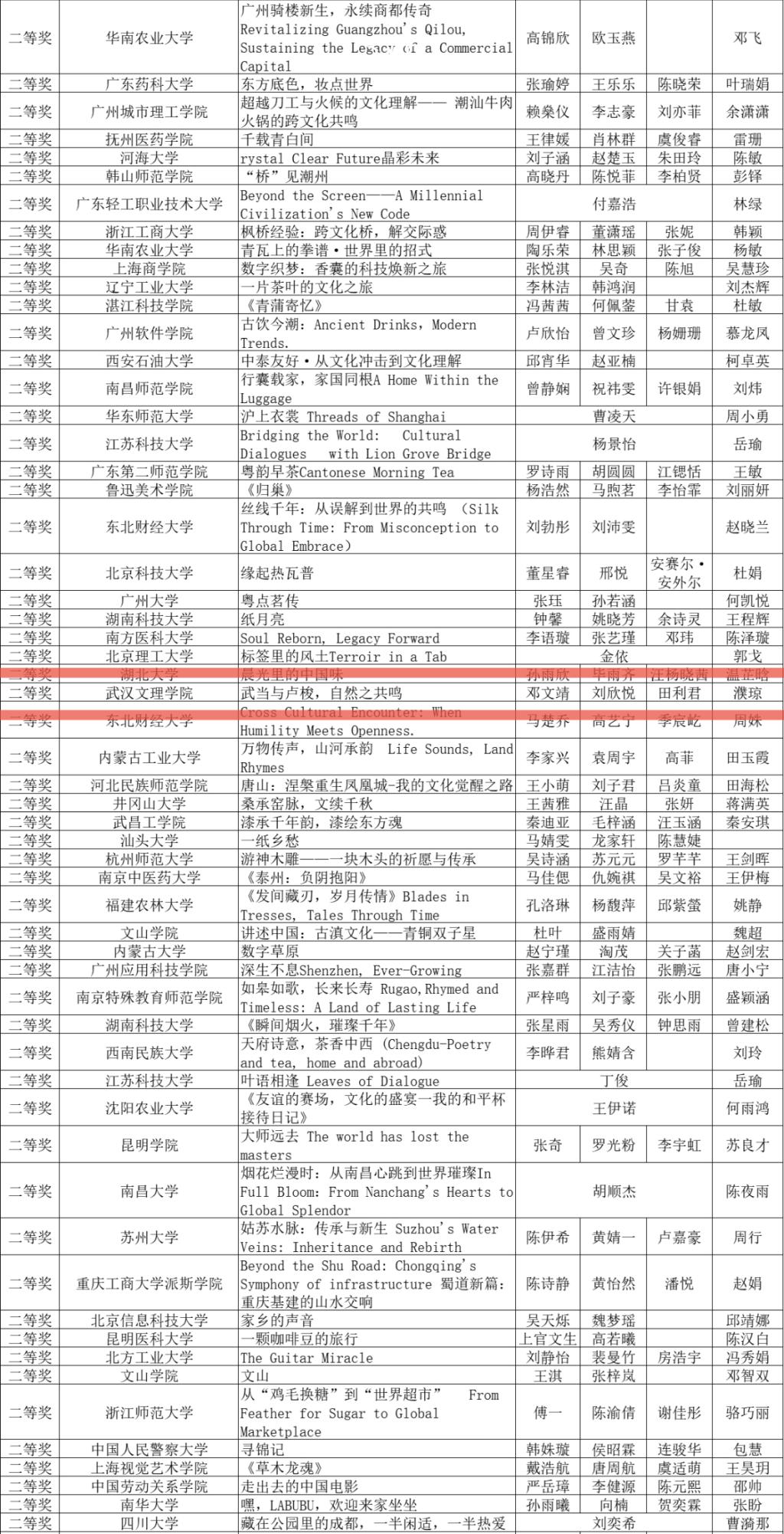 近日,第八届“外教社杯”全国高校学生跨文化能力大赛“讲述中国 传播中国”短视频大赛全国赛获奖名单公示,我校外国语学院邓文靖、刘欣悦、田利君三名同学组成的团队再创佳绩。该团队此前斩获湖北赛区省级一等奖,成功入围国赛,此次凭借《武当武术的自然哲思与卢梭自然教育观的跨时空对话》荣获中国学生本科院校组全国二等奖。