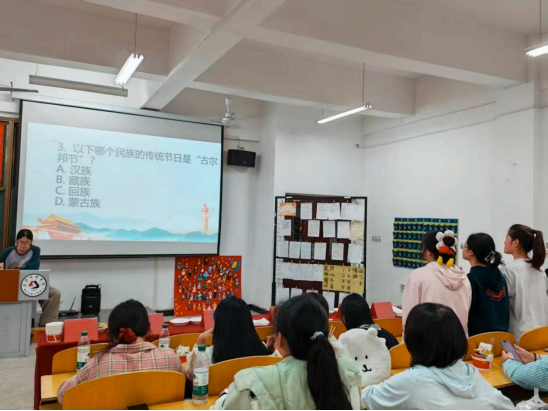 互动环节成为激发青春活力、深化文化认知的“助推器”。“民族知识连连看”游戏中,青年学子随机组队,围绕“民族名称—传统节日—特色服饰—代表性美食”四类卡片展开协作匹配,“藏族对应雪顿节”“维吾尔族的美食是馕”的讨论声此起彼伏,大家在分工协作中巩固知识,在欢声笑语中增进默契;“民族知识竞答”环节采用“必答+抢答”模式,必答题环节各队沉着应对、稳扎稳打,抢答环节则展现出“分秒必争”的紧张氛围,抢到答题权的学子流畅作答,未抢答成功的队伍认真倾听、查漏补缺,掌声与欢呼声交织,将活动气氛推向高潮。