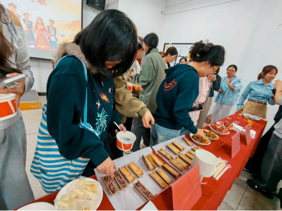 活动现场处处洋溢着民族文化交融的浓厚氛围。在“舌尖上的民族风情”美食区,内蒙古奶酪的纯净奶香、酥油茶的醇厚咸香、竹筒饭的清香软糯、牛肉粒的浓郁风味轮番“登场”,各民族特色美食不仅满足了大家的味蕾,更成为传递民族文化的“活名片”,青年学子围坐品尝、交流心得,在分享中拉近了心与心的距离。