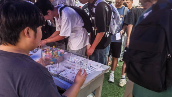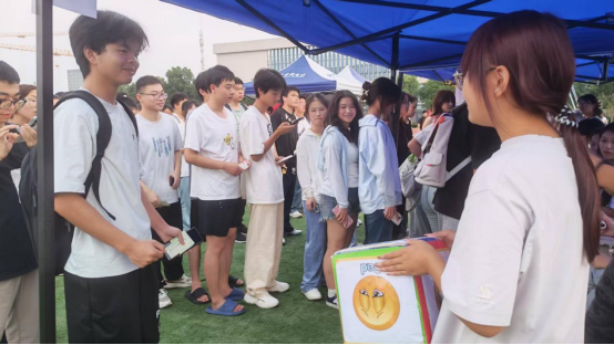 活动正式开启后,各成员各司其职:负责“情绪盲盒交换站”的成员耐心引导同学书写情绪、交换卡片,让心灵的温暖在卡片流转中传递;“心理韧性拼图挑战”摊位的成员积极协助同学们组队拼接、解读心理韧性元素,在协作中解锁成长力量;“情绪骰子”区域的成员有序组织大家投掷骰子、模仿情绪表情,现场充满欢声笑语。会长和部长们则在各摊位间巡视,及时协调人员、维持现场秩序,全力保障活动按流程顺利开展。参与者依据规则参与游戏集章、兑换礼品,集满五个学院的章才可签到,在趣味互动中收获心理知识与暖心福利。